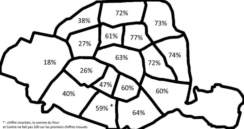 Enfin, et dans la série des biais méthodologiques, j’ignore si je dois a) Pouffer de rire b) M’étrangler de stupéfaction ou c) Les deux (veuillez cocher l’option correspondant le mieux à votre opinion) face à la carte des résultats par arrondissement publiée dès le lendemain du vote par David Belliard. L’"adjoint à la Maire de Paris en charge des mobilités et de la transformation de l'espace public" nous en livre en commentaire une drôle d’analyse pseudo-sociologique, selon laquelle "Le rapport à la voiture dans la capitale est lié à son niveau de revenu. En gros, plus on appartient à un milieu aisé, plus on veut conserver sa voiture. Sans surprise, les habitants du 16e, un arrondissement huppé de la capitale, ont rejeté à 82% la proposition d'augmentation des tarifs. A l'opposé, les arrondissements de l'est parisien, plus mixtes socialement, ont, eux, voté massivement en faveur de la mesure".