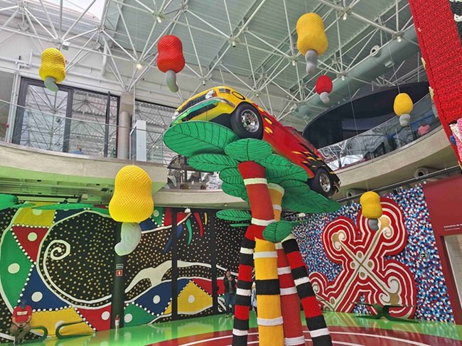 Celle que j’ai eu le loisir d’admirer il y a deux semaines était juchée au sommet d’une structure évoquant un cajueiro, autrement dit l’anacardier produisant la pomme de cajou, fruit jaune-orangée connu chez nous pour la noix du même nom qui en constitue la graine, particulièrement prisée à l’heure de l’apéritif. Pointant son long capot vers le ciel, cette Uirapuru-là exhibe fièrement sa carrosserie peinte aux couleurs du plumage de celui dont elle emprunte le nom, même si datant de 1964, celle-ci est en fait probablement une 4200 GT assemblée sous l’égide de Brasinca. Un détail qu’ignorera volontiers le visiteur, s’intéressant plutôt au décor accueillant la scène conçu par trois artistes indigènes. Evoquant la forêt amazonienne, celui-ci ne manque pas de surprendre par la technique utilisée, puisque réalisé par 200 crocheteuses de la région de Brasilia.
