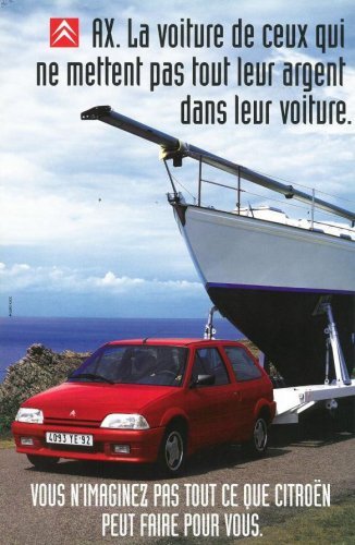 Peut-être parce qu’eux savent qu’entre un "me too product" et une belle auto, le résultat n’est jamais garanti, et vice-versa. Et que ce qui est embêtant -à moins que ce ne soit rassurant- avec l’être humain, c’est que ses décisions procèdent systématiquement de process émotionnels, quant bien même elles revêtent l’apparence de la plus grande rationalité. Ce qu’illustre parfaitement l’excellente pub de fin de vie de la Citroën AX présentée comme "la voiture de ceux qui ne mettent pas tout leur argent dans la voiture", où l’on voit la petite berline tractant un bateau trois fois plus gros qu’elle. Ou comment démontrer que le sens de l’économie -la pingrerie diront certains- procède aussi de l’affect.