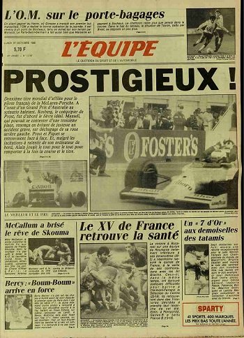 Vaincu par son immobilisme tranquille, je me résous à jeter un œil au quotidien qui détourne son attention des lumières de la sociologie politique, du droit constitutionnel ou de l’introduction aux sciences sociales. "Prostigieux !" y proclame la une de l’Equipe, qui commémore le deuxième titre du pilote français, obtenu la veille au Grand Prix d’Australie. Sa McLaren MP4/2C s’y affiche en photo au côté de la Williams FW11 blessée de Nigel Mansell, pneu arrière gauche éclaté.
