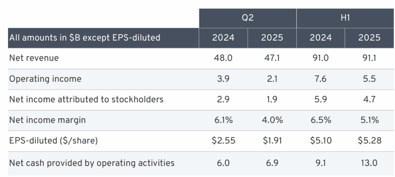 Il les a confirmées mardi tout en soulignant que le second semestre devrait être inférieur au premier car la période sera affectée en totalité par les droits de douane, alors que seul le deuxième trimestre l'a été sur la première partie de l'année.