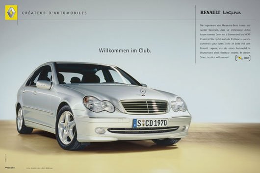 Monsieur le Secrétaire général n’évoque pas Laguna par hasard. La berline du segment D deuxième du nom fut non seulement le premier modèle au monde à obtenir la cotation maximale de 5 étoiles, mais aussi l’instigateur d’une longue lignée de Renault, quand le constructeur de Boulogne-Billancourt s’enorgueillissait de faire la course en tête sur le sujet, se targuant même à un moment de détenir au sein de sa gamme la moitié des modèles ayant obtenu la note maximale. En 2002, la filiale allemande du constructeur français s’autorisait d’ailleurs une pique lorsque la deuxième génération de Mercedes Classe C (génération W203) décrochait elle aussi ses cinq stars, avec une pub exposant la berline allemande sous un triomphant “Willkommen im Club“ (bienvenue au club). Dans les bureaux de Stuttgart, le “kolossaler französischer Humor“ a dû provoquer un certain nombre de fausses routes chez les dirigeants de la marque …à l’étoile