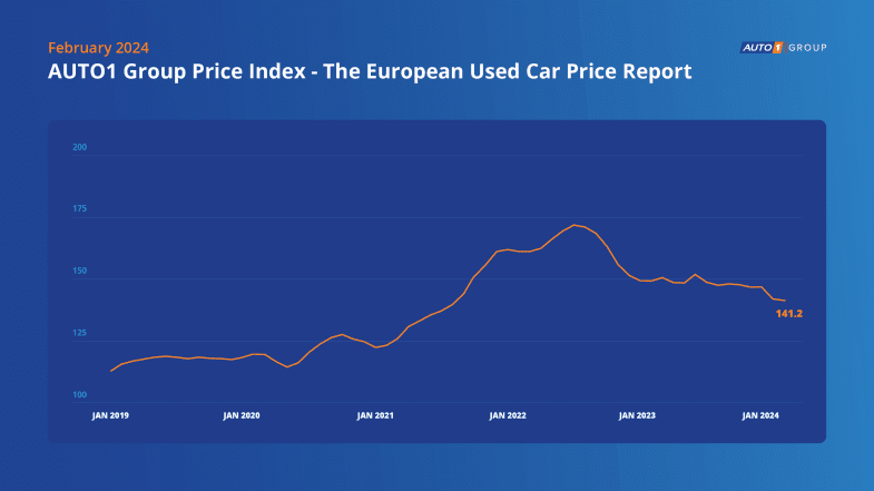 Auto1, qui mesure pour sa part les prix à professionnels en Europe, constate également une légère baisse (-0,6%) sur un mois et de 5,3% sur un an. Il faut toutefois relativiser car malgré cette baisse les prix sont toujours 22,6% plus élevés qu'en février 2019 (graphe ci-dessous).