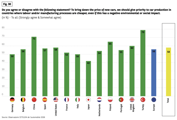 The most surprising response from motorists is as follows: production must take place in the cheapest countries, ‘even if this has a negative environmental or social impact’, according to a majority of Europeans (56%), to 60% of British and even the French (52%). ‘Young people are by far more favourable to the idea than their elders, as are residents of large cities compared with those in rural areas,’ comments the Observatoire Cetelem.