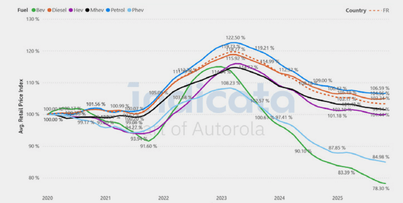 The accelerated turnover of electric models has not happened without sacrifices regarding sales prices. Even in Denmark, where electric vehicles account for 52% of professional used car sales (compared to 23% in January 2024) and sell in an average of 49 days, their prices have droped by 35% since 2020, while those of other engine types have risen (except for PHEVs, which are down 19%).