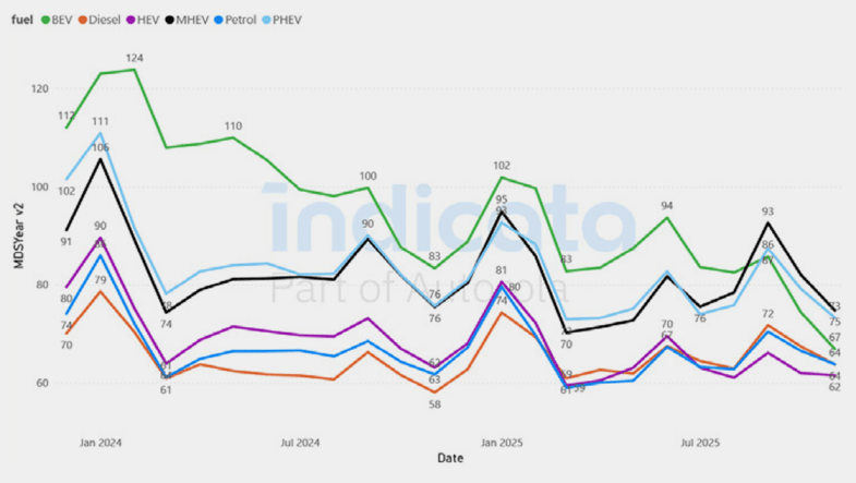 The latest report on the European used car market published by Indicata, part of the Autorola group, reveals that electric vehicles have caught up in terms of turnover rates in Europe. The average time to sell (expressed in ‘Market Days Supply’, graph below) an electric used vehicle is now only 67 days, compared to 102 days in January 2025 and 122 days in January 2024.